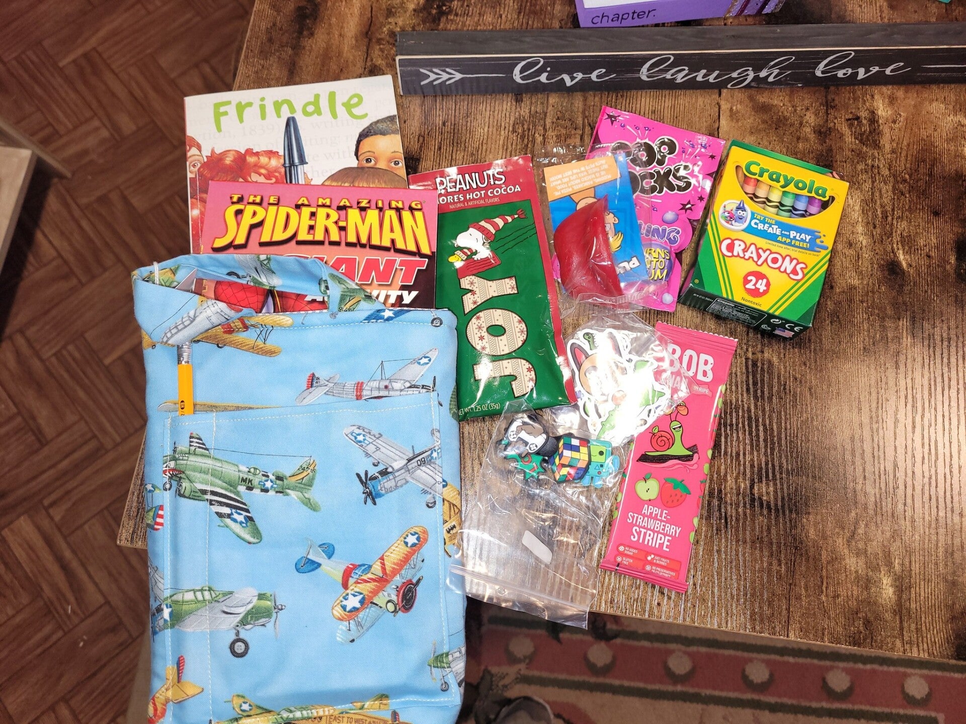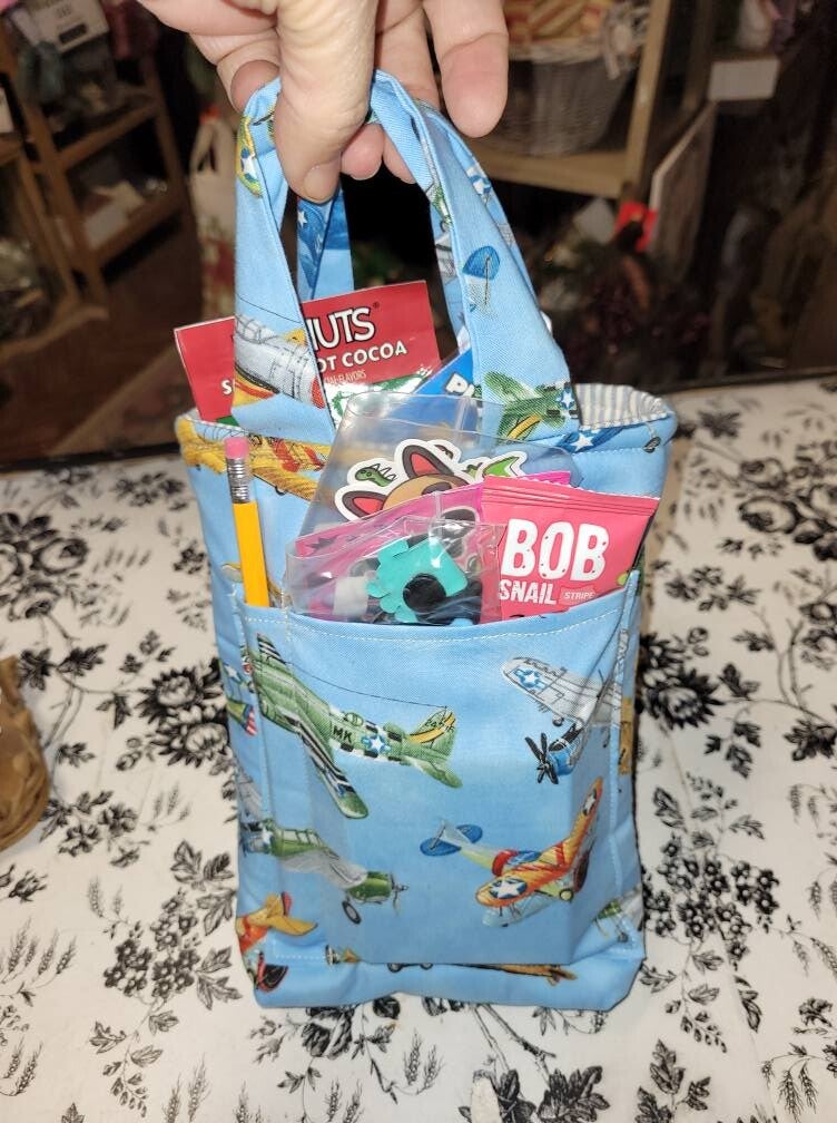 This beautifully handmade kids fun tote is filled with goodies any child would love. This tote is made out of cotton fabric, heavy duty, washable and reusable and is made by one of our amazing vendors. The bag is filled with an activity book, pencil, crayons, a book, candy, stickers, a bookmark and a drink pack. These are great for traveling or a trip to a restaurant or babysitters! You may choose from patterns for a boy, girl, or generic. You can also choose your age group.