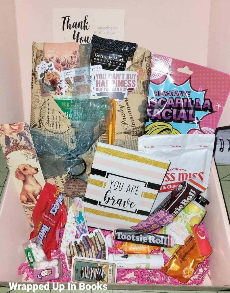 Our beautiful surprise boxes come with a beautifully wrapped Blind Date With A Book, and lots and lots of goodies, including drinks & snacks, and other amazing goodies. You can select your genre, or let us surprise you! After all, the idea of a Blind Date With A Book is to NOT judge a book by it's cover and to read something you wouldn't normally read! We can customize any box to make it just right for you or that extra special person in your life!
